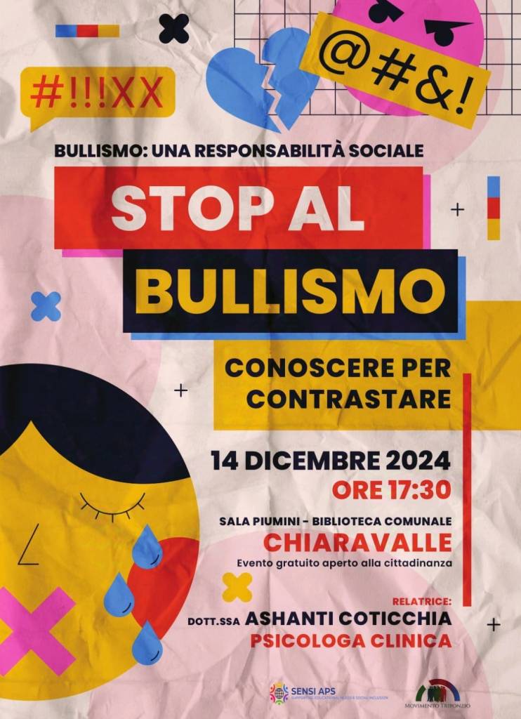STOP AL BULLISMO. CONOSCERE PER CONTRASTARE è il convegno promosso dall ‘A.C. Movimento Triponzio, in collaborazione con S.E.N.S.I. APS che si è tenuto sabato 14 dicembre a Chiaravalle, presso la Sala Piumini della Biblioteca Comunale.