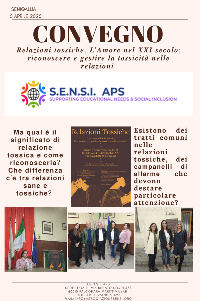 𝑹𝒆𝒍𝒂𝒛𝒊𝒐𝒏𝒊 𝒕𝒐𝒔𝒔𝒊𝒄𝒉𝒆. 𝑳’𝑨𝒎𝒐𝒓𝒆 𝒏𝒆𝒍 𝑿𝑿𝑰 𝒔𝒆𝒄𝒐𝒍𝒐: 𝒓𝒊𝒄𝒐𝒏𝒐𝒔𝒄𝒆𝒓𝒆 𝒆 𝒈𝒆𝒔𝒕𝒊𝒓𝒆 𝒍𝒂 𝒕𝒐𝒔𝒔𝒊𝒄𝒊𝒕𝒂̀ 𝒏𝒆𝒍𝒍𝒆 𝒓𝒆𝒍𝒂𝒛𝒊𝒐𝒏𝒊 è il convegno promosso dall ‘A.C. Movimento Triponzio, in collaborazione con S.E.N.S.I. APS che si è tenuto sabato 5 aprile 2025 presso il Circolo ACLI U. RAVETTA APS di Senigallia – si è discusso di come sempre più spesso sentiamo parlare di relazione tossica, quella in cui ci si trovi a pensare di essere non supportato, incompreso, umiliato o attaccato. 𝗠𝗮 𝗾𝘂𝗮𝗹 𝗲̀ 𝗶𝗹 𝘀𝗶𝗴𝗻𝗶𝗳𝗶𝗰𝗮𝘁𝗼 𝗱𝗶 𝗿𝗲𝗹𝗮𝘇𝗶𝗼𝗻𝗲 𝘁𝗼𝘀𝘀𝗶𝗰𝗮 𝗲 𝗰𝗼𝗺𝗲 𝗿𝗶𝗰𝗼𝗻𝗼𝘀𝗰𝗲𝗿𝗹𝗮? 𝗖𝗵𝗲 𝗱𝗶𝗳𝗳𝗲𝗿𝗲𝗻𝘇𝗮 𝗰’𝗲̀ 𝘁𝗿𝗮 𝗿𝗲𝗹𝗮𝘇𝗶𝗼𝗻𝗶 𝘀𝗮𝗻𝗲 𝗲 𝘁𝗼𝘀𝘀𝗶𝗰𝗵𝗲? Esistono dei tratti comuni nelle relazioni tossiche, dei 𝗰𝗮𝗺𝗽𝗮𝗻𝗲𝗹𝗹𝗶 𝗱𝗶 𝗮𝗹𝗹𝗮𝗿𝗺𝗲 che devono destare particolare attenzione. Va però detto che il più delle volte questi segnali, tanto chiari a un occhio esterno e magari esperto, sono meno riconoscibili da chi si trova all’interno della relazione stessa. Con la 𝐏𝐬𝐢𝐜𝐨𝐥𝐨𝐠𝐚 𝐃𝐨𝐭𝐭.𝐬𝐬𝐚 𝐀𝐬𝐡𝐚𝐧𝐭𝐢 𝐂𝐨𝐭𝐢𝐜𝐜𝐡𝐢𝐚 abbiamo approfondito 𝒍𝒂 𝒇𝒊𝒈𝒖𝒓𝒂 𝒅𝒆𝒍𝒍’𝒂𝒃𝒖𝒔𝒂𝒏𝒕𝒆 e di come tale figura si presenti come una persona amabile e gentile, per poi gettare la maschera nel momento in cui la relazione diventa intima, diventando così un vero tiranno: insensibile, egocentrico, manipolatore ed incapace di mettersi nei panni dell’altro. Le relazioni tossiche possono avere effetti di vasta portata e profondamente dannosi su ogni aspetto della vita. Riconoscere questi effetti è il primo passo per agire e recuperare il proprio benessere.
